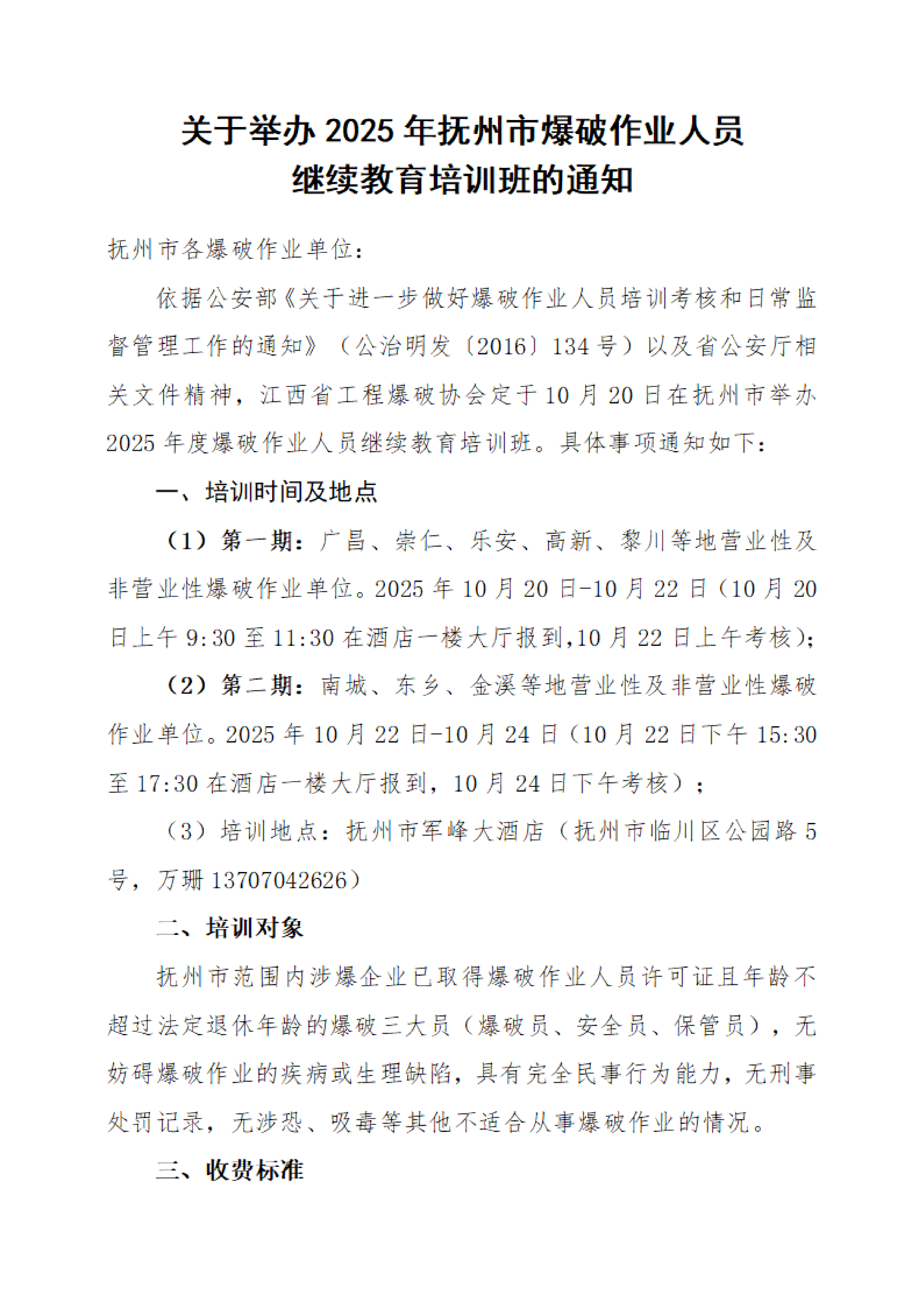 关于举办2025年抚州市爆破作业人员继续教育培训班的通知